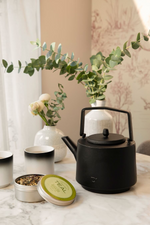 Cast iron tea pot capacity 1 liter with stainless steel strainer and two ceramic cups.